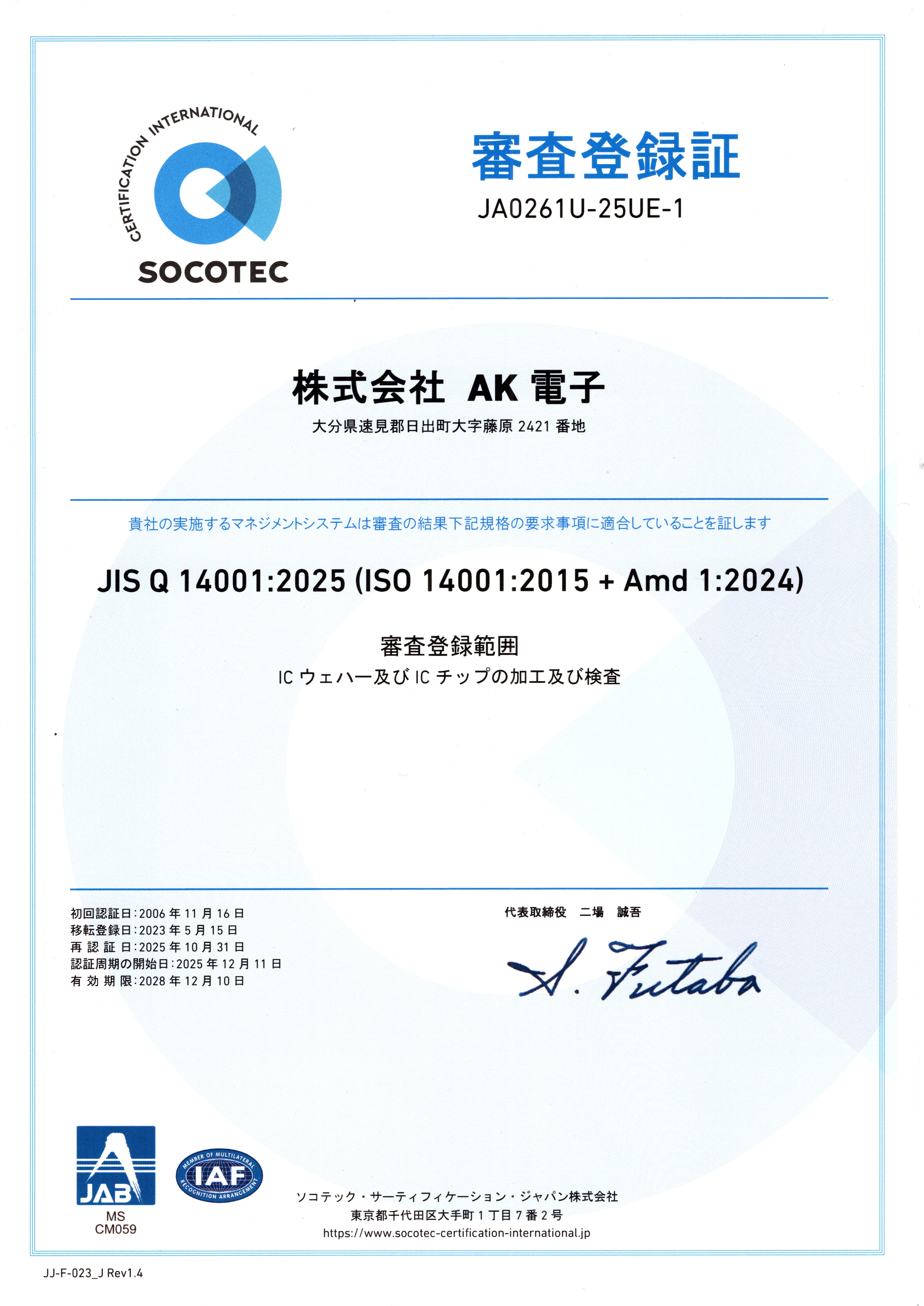 株式会社AK電子は、企業発足とともに「環境方針」に取り組み、企業活動のあらゆる面で環境保全に配慮、行動し、ISO14001/2015(2016年12月審査登録)認証を取得登録し、環境マネジメントシステムの構築と継続的改善に努めております。